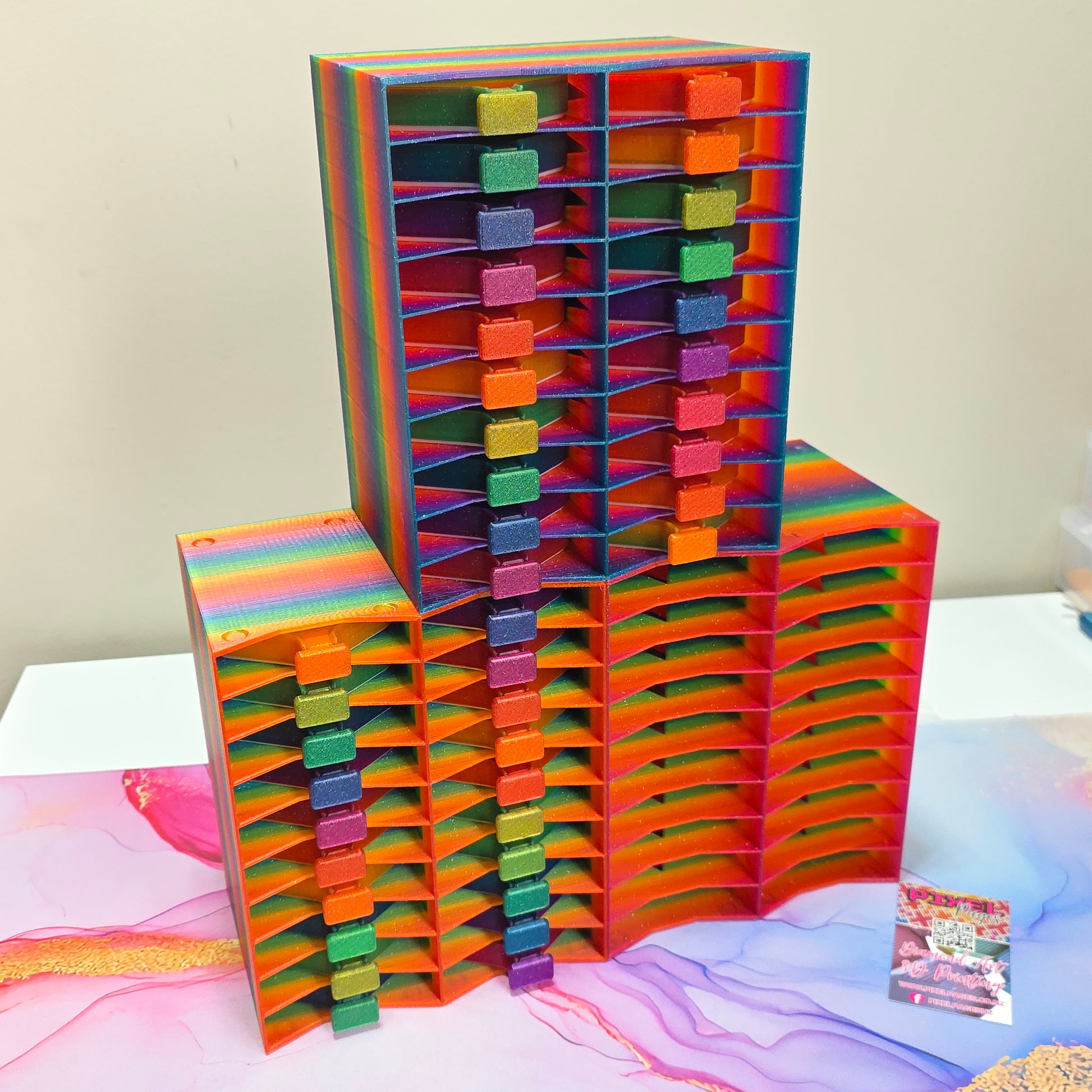 The 20 slot stack-able tray tower is the perfect organizational tool for your diamond painting trays. Made with 3D printing technology, this tower ensures easy access and storage for up to 10 trays at once and they are also stack-able so you can mix and match till your hearts content!Ā Say goodbye to scattered trays and hello to a more efficient and streamlined diamond painting experience!